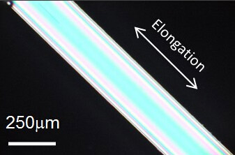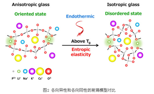 稻葉誠司和他的研究團(tuán)隊(duì)用化學(xué)成分是Li0.25Na0.25K0.25Cs0.25PO3混合堿金屬偏磷酸鹽玻璃進(jìn)行了實(shí)驗(yàn)。這種氧化物玻璃是各向同性的,在室溫下既硬又脆,容易破碎,和普通玻璃是一樣的。然而,當(dāng)它被加熱到玻璃化轉(zhuǎn)化溫度Tg時(shí),然后冷卻進(jìn)入拉伸狀態(tài),玻璃就變成各向異性(晶體的各向異性即沿晶格的不同方向,原子排列的周期性和疏密程度不盡相同,由此導(dǎo)致晶體在不同方向的物理化學(xué)特性也不同)。