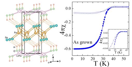 圖:(Li0.8Fe0.2)OHFeSe超導(dǎo)體的晶體結(jié)構(gòu)(左)和磁化率曲線(右)