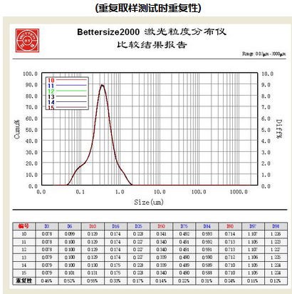 重復(fù)性好的原因:① 穩(wěn)定有效的分散系統(tǒng)。② 激光器、探測(cè)器、信號(hào)傳輸系統(tǒng)穩(wěn)定可靠。③ 自動(dòng)對(duì)中系統(tǒng)使儀器始終保持在最佳狀態(tài)。④ 采樣速度達(dá)3500次/秒,大量數(shù)據(jù)有效減少少數(shù)異常數(shù)據(jù)對(duì)重復(fù)性的影響。⑤ 鏡頭采用從日本進(jìn)口的高精度透鏡組,成像清晰,畸變很小,保證了微弱的、各種角度的散射光信號(hào)無一漏網(wǎng)。