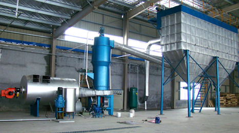 待干燥物料送入干燥段內(nèi)在粉碎裝置的作用下,與熱空氣充分接觸,干細粉通過分級機進入收料系統(tǒng)被收集,未達到細度要求的物料在分級機的作用下,被下拋到干燥段內(nèi)繼續(xù)被粉碎和干燥。