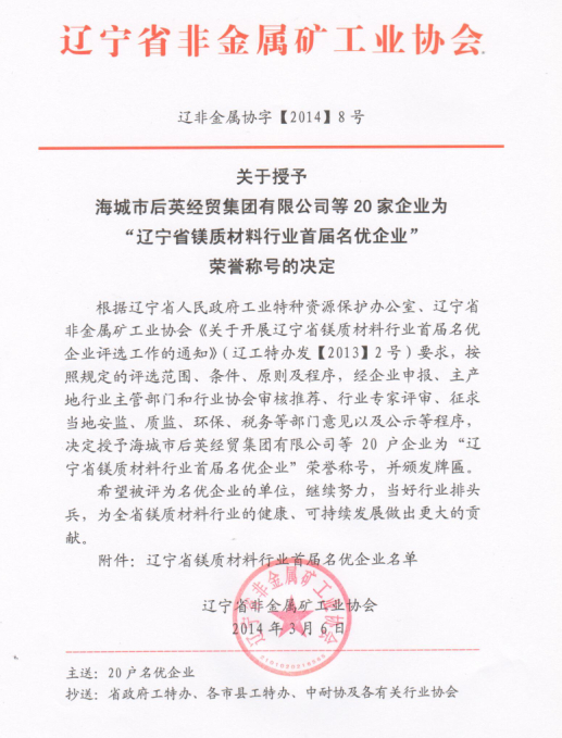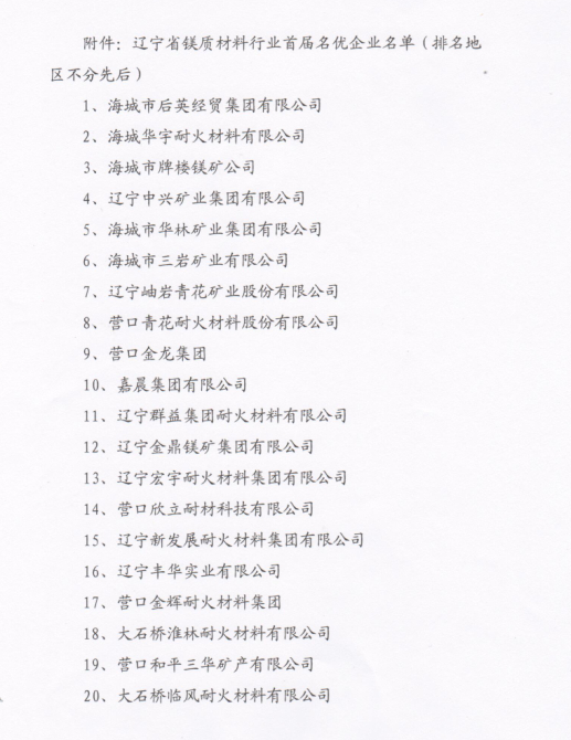 遼寧省鎂質(zhì)材料行業(yè)首屆名優(yōu)企業(yè)名單