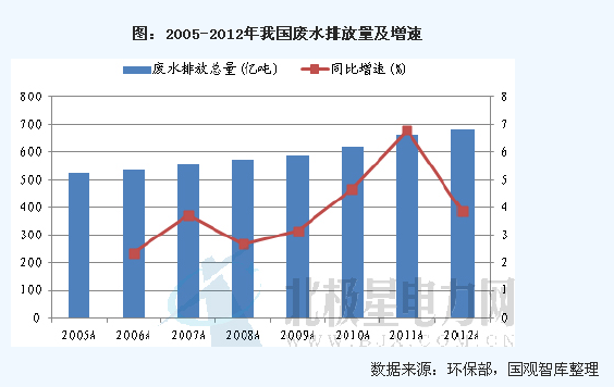 2005年以來(lái),我國(guó)廢水排放總量持續(xù)增長(zhǎng),2012年排放量為684.60億噸,同比增長(zhǎng)3.85%,其中生活廢水排放462.7億噸,同比增長(zhǎng)8.13%,占比67.59%;工業(yè)廢水為221.6億噸,同比略降4.02%,占比32.37%。