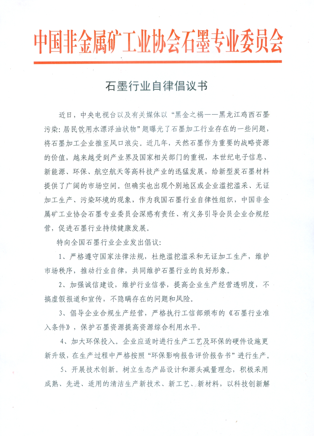 | 加強(qiáng)行業(yè)自律,促進(jìn)清潔生產(chǎn) ——石墨專委會(huì)發(fā)出石墨行業(yè)自律倡議書 |