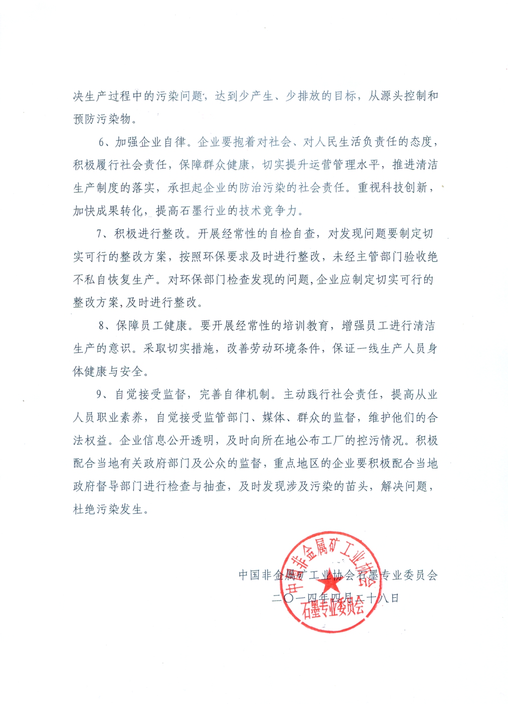 3、倡導(dǎo)企業(yè)合規(guī)生產(chǎn)經(jīng)營(yíng),嚴(yán)格執(zhí)行工信部頒布的《石墨行業(yè)準(zhǔn)入條件》,保護(hù)石墨資源提高資源綜合利用水平。