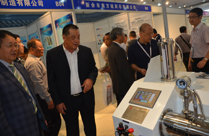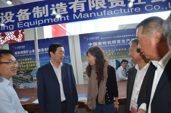 中國(guó)非金屬礦工業(yè)協(xié)會(huì)胡勤會(huì)長(zhǎng)(左二)參觀桂林鴻程公司展位