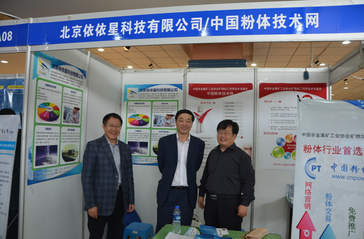 中國(guó)非金屬礦工業(yè)協(xié)會(huì)會(huì)長(zhǎng)胡勤、湖南超牌科技有限公司董事長(zhǎng)馮建明與杜高翔副教授在中國(guó)粉體技術(shù)網(wǎng)展位前合影
