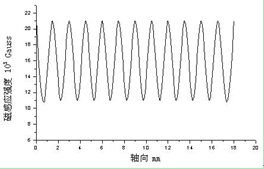 感應(yīng)輥是磁選機(jī)的關(guān)鍵部件,GCG型采用疊加平齒結(jié)構(gòu),磁場(chǎng)強(qiáng)度達(dá)到20000GS以上,磁場(chǎng)梯度也高達(dá)到1×107GS/m以上,且磁場(chǎng)峰值密度更大,磁場(chǎng)分布如圖2所示。該磁場(chǎng)可以高效分離出非金屬礦物中比磁化系數(shù)為1.9×10-7~7.5×10-6的弱磁性雜質(zhì)。