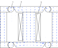 磁路結(jié)構(gòu)直接影響磁場(chǎng)的分布,為了達(dá)到較高的磁場(chǎng)強(qiáng)度,磁路要盡可能的短,空氣隙要盡可能小,漏磁要盡可能小,基于以上考慮設(shè)計(jì)了如圖3所示“日”字形磁路。整個(gè)磁路采用鎧裝結(jié)構(gòu),激磁線圈設(shè)在中心的磁軛上,感應(yīng)輥分布在磁路的四周,磁力線走向沿磁路對(duì)稱分布。
