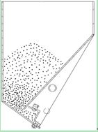 干式物料最常用的給料方式是電磁振動(dòng)給料機(jī),其缺點(diǎn)是故障率高。GCG型電磁強(qiáng)磁選機(jī)的不再采用振動(dòng)給料器,而是設(shè)計(jì)了新的給料裝置,如圖4所示,該給料裝置分為儲(chǔ)料區(qū)和給料區(qū),儲(chǔ)料區(qū)用來(lái)儲(chǔ)存物料,對(duì)物料的堆積起緩沖作用,底部給料去區(qū)與儲(chǔ)料區(qū)通過(guò)縫隙相通,且聯(lián)通縫隙底部給料板與水平面設(shè)計(jì)為大于60°斜角結(jié)構(gòu),有利于兩個(gè)儲(chǔ)料區(qū)干式細(xì)粒物料的流通。干式礦粒流通到輔儲(chǔ)料區(qū)后以一定的角度堆積于輔儲(chǔ)料區(qū),但是不能充滿,故該給料區(qū)物料松散。
