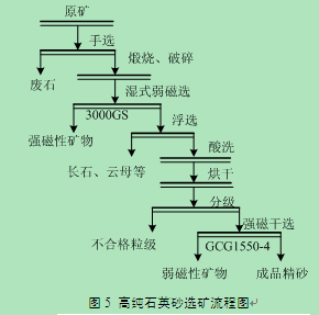 江蘇某高純石英砂生產(chǎn)企業(yè)2010年采用北京礦冶研究總院研制的GCG1550-4型電磁感應(yīng)輥強(qiáng)磁選機(jī)應(yīng)用于其選礦流程的除鐵作業(yè),見(jiàn)圖5所示,實(shí)踐表明通過(guò)弱磁除鐵,浮選,酸洗后石英砂含鐵量為0.00118%,烘干后再經(jīng)GCG1550-4電磁感應(yīng)輥強(qiáng)磁選機(jī)分選后可獲得含鐵量為0.00021%高純石英砂,除鐵率在82%以上,大幅降低了高純石英砂的含鐵量,實(shí)現(xiàn)了高純石英砂礦的有效利用。