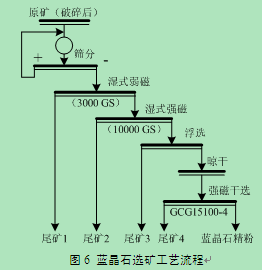 為了降低藍(lán)晶石礦含鐵量,提高礦山的綜合經(jīng)濟(jì)效益,2013年該廠采用GCG15100-4型電磁感應(yīng)輥強(qiáng)磁選機(jī)取代原流程末端的永磁筒式干選機(jī),選礦流程見(jiàn)圖6。實(shí)踐表明,在給入磁選機(jī)藍(lán)晶石含鐵量1.86%條件下,經(jīng)過(guò)該設(shè)備后,藍(lán)晶石含鐵量降低到1.02%,除鐵率在45%以上,給該企業(yè)帶來(lái)了較好的經(jīng)濟(jì)效益。
