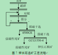 河南某鉀長(zhǎng)石廠2012年新建一條年處理3萬(wàn)噸鉀長(zhǎng)石生產(chǎn)線,原礦經(jīng)破碎-高壓輥磨-弱磁干選后得到含鐵量為0.58%的鉀長(zhǎng)石精礦。為了降低精礦含鐵量,提高企業(yè)的經(jīng)濟(jì)效益,2013年該廠進(jìn)行工藝流程改造,采用GCG1550-4電磁強(qiáng)磁選機(jī)進(jìn)行鉀長(zhǎng)石精礦的干法強(qiáng)磁除鐵提純,生產(chǎn)流程見(jiàn)圖7。實(shí)踐表明經(jīng)過(guò)GCG1550-4磁選機(jī)后,鉀長(zhǎng)石含鐵量由0.58%降低到0.11%,除鐵率在81%以上,產(chǎn)品質(zhì)量得到大幅提升。