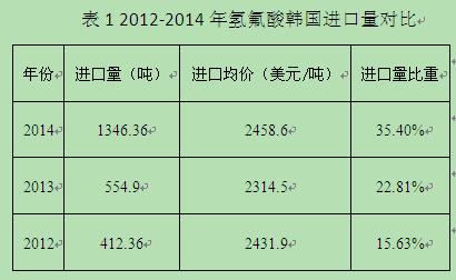 從歷年數(shù)據(jù)不難看出,國內(nèi)對韓氫氟酸進口量逐年攀升。2014年進口總量達1346.362噸,占進口總比重的35.4%,為進口第一大國。數(shù)據(jù)面赤裸裸的揭示出我國螢石市場所面臨的尷尬境地,即先以“白菜價”出口螢石原料,再用“黃金價”購買國外高端氟化工產(chǎn)品,這顯然不是長久之道。