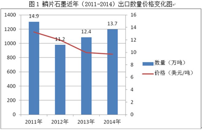 2011-2014年我國(guó)鱗片石墨出口數(shù)量基本穩(wěn)定,保持在11到13萬(wàn)噸區(qū)間,出口價(jià)格呈現(xiàn)下降趨勢(shì),由2011年的1200美元/噸,逐漸下降至900美元/噸。(見圖1)