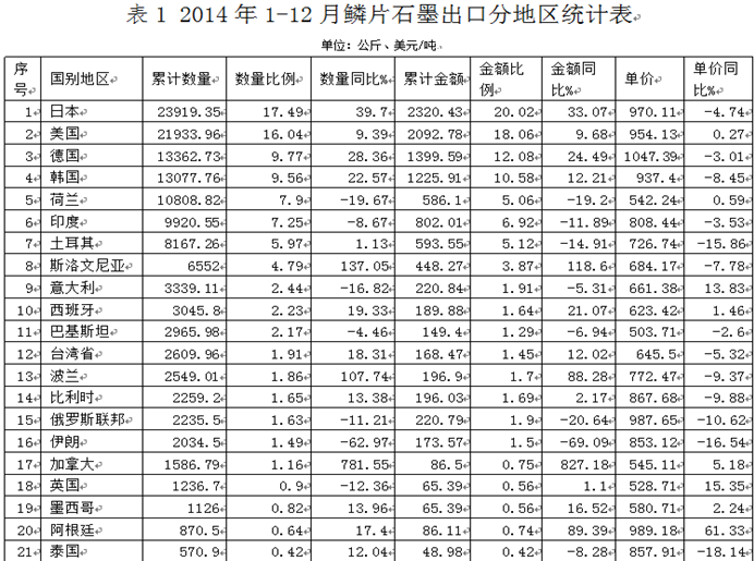 中國(guó)石墨產(chǎn)品質(zhì)優(yōu)價(jià)廉,品種齊全,在國(guó)際市場(chǎng)上具有較強(qiáng)的競(jìng)爭(zhēng)能力并享有很高的聲譽(yù),已成為中國(guó)出口量最大的非金屬礦產(chǎn)品之一。目前,中國(guó)晶質(zhì)石墨出口的增長(zhǎng)速度為世界第一,出口量占晶質(zhì)石墨國(guó)際市場(chǎng)的一半左右,成為世界第一石墨出口大國(guó),共計(jì)出口40余個(gè)國(guó)家和地區(qū)。