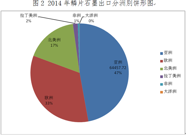 2014年我國(guó)出口海關(guān)統(tǒng)計(jì)顯示,日本、美國(guó)、德國(guó)是我國(guó)鱗片石墨的主要出口市場(chǎng)。日本是我國(guó)鱗片石墨出口的最大市場(chǎng),出口量達(dá)2.39萬(wàn)噸,同比增長(zhǎng)39.7%,出口平均價(jià)格為970美元/噸,同比下降4.74%。美國(guó)為2.1萬(wàn)噸,數(shù)量略低于日本,同比增長(zhǎng)9.4%,出口平均價(jià)格為954美元/噸,同比增長(zhǎng)0.27%。德國(guó)列第三位,數(shù)量為1.3萬(wàn)噸,同比增加28.4%,出口平均價(jià)格為1047美元/噸,同比下降3%(見表1)。從石墨出口分洲別統(tǒng)計(jì)可以看出口,亞洲、歐洲、美洲是我國(guó)鱗片石墨出口的主要市場(chǎng),合計(jì)占據(jù)了出口總量的97%(見圖2)。