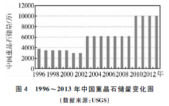 中國是世界上重晶石儲量最大的國家,且一直呈現(xiàn)穩(wěn)中有升的態(tài)勢?2010~2013年的統(tǒng)計(jì)數(shù)據(jù)顯示中國重晶石儲量為1億t(圖4),占世界總儲量的29%?我國的重晶石資源分布較為集中,主要分布在四川?貴州?廣西等地區(qū)?其中貴州重晶石的儲量最大,占我國總儲量的32.1%?