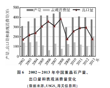 2002~2008年隨著我國經(jīng)濟(jì)的飛速發(fā)展,對外貿(mào)易量逐年增加,我國的重晶石產(chǎn)量和對外出口量也在逐年增加?但是由于資源的過度開發(fā),國家在2008年12月對重晶石開始加征關(guān)稅;2008年在美國開始波及全球的金融危機(jī)造成了中國對外貿(mào)易量的銳減?雙重原因使得我國的重晶石在2009年產(chǎn)量和對外出口量出現(xiàn)大幅下降,此后產(chǎn)量穩(wěn)定在400萬t,對外出口量也開始上升?2013年我國重晶石產(chǎn)量380萬t,國內(nèi)消費(fèi)量174.2萬t,增長較為明顯,相應(yīng)的出口量出現(xiàn)下降,再次降到200萬t左右(圖6)?