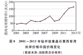 目前國際上重晶石交易采用的是合同定價(jià)的機(jī)制,但由于品位?開發(fā)成本以及交通條件等的不同,國內(nèi)還沒有統(tǒng)一的重晶石交易市場,也沒有統(tǒng)一的定價(jià)機(jī)制,貴州地區(qū)的價(jià)格略高于其他地區(qū)?中國最大的貿(mào)易對象是美國,采用墨西哥灣到岸價(jià)格?目前市場上關(guān)于重晶石有兩種價(jià)格:鉆井級?涂料級?涂料級用量較少,但是附加值較高,市場價(jià)格穩(wěn)定在250美元/t,在2009年6~9月曾一度飆升到了3000美元左右(國際市場商品價(jià)格網(wǎng));鉆井級重晶石用量較大,加工程度小,市場規(guī)模大,而且保持平穩(wěn)上升的趨勢,價(jià)格從2005年7月的65美元/t到現(xiàn)在的160美元/t,市場價(jià)格幾乎沒有下降過(圖8)?