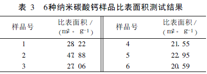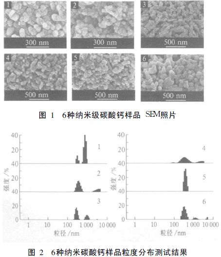 圖1、圖2及表3為中國無機(jī)鹽工業(yè)協(xié)會(huì)專家委員會(huì)對中國納米級碳酸鈣部分企業(yè)產(chǎn)品進(jìn)行的晶型、粒度分布和比表面積測試結(jié)果,共6種產(chǎn)品:1—塑料專用納米碳酸鈣;2—油墨專用納米碳酸鈣;3—CC-5納米碳酸鈣;4—CC納米碳酸鈣;5—CCR納米碳酸鈣;6—SCC-3納米碳酸鈣。上述產(chǎn)品應(yīng)用效果好, 有的品種已達(dá)到國際先進(jìn)水平。