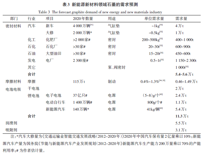 石墨材料良好的潤(rùn)滑性源于石墨晶體結(jié)構(gòu),因此,應(yīng)用生產(chǎn)干粉石墨潤(rùn)滑劑、水基石墨潤(rùn)滑劑、油 劑石墨潤(rùn)滑劑等產(chǎn)品。一些學(xué)者也研究了關(guān)于石墨在不同潤(rùn)滑劑中的添加量的問題。如水基石墨潤(rùn)滑劑中,石墨微粒的含量一般在20%~40%。在石墨吸附劑石墨含量研究方面,不同的配比基于不同的原料,石墨的混合比例也顯示出了巨大的差別。石墨潤(rùn)滑劑、石墨吸附劑種類多種多樣,且未有詳盡的現(xiàn)狀及預(yù)測(cè)資料。本研究分別基于制動(dòng)、密封材料的發(fā)展?fàn)顩r,對(duì)其未來石墨的需求狀況進(jìn)行了粗略的判斷。預(yù)計(jì)到2020年中國(guó)應(yīng)用于潤(rùn)滑劑、吸附劑的石墨需求量為5.5萬t和3.1萬t。