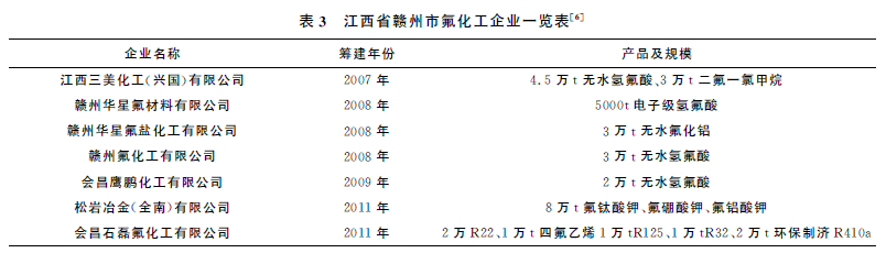 據(jù)統(tǒng)計,贛州地區(qū)目前有螢石采礦證56個,比2004年減少了20家?礦區(qū)利用率85%,占用資源儲量1050萬t,資源儲量利用率82.5%?螢石生產(chǎn)主要集中在興國、瑞金、會昌、寧都等四縣,九十年代前礦山多以賣螢石塊礦為主,九十年代中期螢石精粉逐步取代塊礦,并于2007年開始建設(shè)氫氟酸企業(yè),螢石生產(chǎn)逐漸向深加工轉(zhuǎn)移?目前螢石精粉企業(yè)巳達26家,氟化工企業(yè)7家其中在建2家)(表3),采選能力73.2萬t/年,并已形成年產(chǎn)9.5萬t無水氫氟酸?5000t電子級氫氟酸?3萬t二氟一氯甲烷(R22)?3萬t無水氟化鋁?2011年籌建的氟化企業(yè)兩家投產(chǎn)后可新增8萬t氟鈦酸鉀?氟硼酸鉀?氟鋁酸鉀,2萬R22?1萬t四氟乙烯?1萬tR125?1萬tR32?2萬t環(huán)保制濟R410a產(chǎn)能?