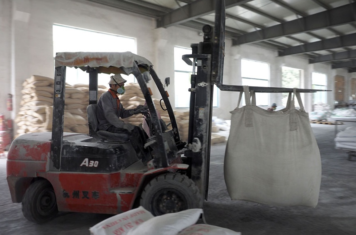 11月25日,在旺高工業(yè)區(qū)一家粉體加工企業(yè)車間,一輛叉車正在吊裝碳酸鈣顆粒。