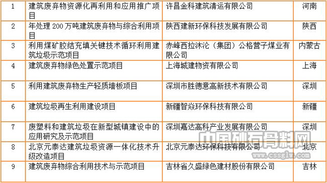 《國家資源再生利用重大示范工程建議名單》中的建筑垃圾資源化工程(圖片來源:中國砂石骨料網(wǎng))