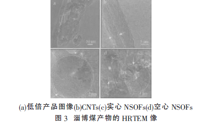 藺嫻等以淄博貧煤為原料,合成碳納米管(carbon nanotubes,CNTs) 和納米富勒烯(nano -structured onion -like fullerenes,NSOFs),運用高分辨透射電子顯微鏡(HRTEM)等對產(chǎn)物進行了表征和分析。圖3 淄博煤產(chǎn)物的HRTEM 像結(jié)果表明:以淄博貧煤為原料制備出CNTs 和NSOFs,CNTs 直徑分布均勻,準球狀的NSOFs 直徑分布在8 nm~30 nm 之間,石墨化程度較高。