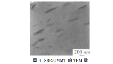 有機-無機納米復(fù)合材料是近10 年來材料科學(xué)領(lǐng)域研究的熱點。目前,橡膠工業(yè)廣泛采用層狀硅酸鹽作為無機填料。谷正等對蒙脫上(MMT)進行了有機化改性。制備了丁苯橡膠(SBR)/有機蒙脫上(OMMT)納米復(fù)合材料。由圖4 SBR/ OMMT的TEM 像可以看出,OMMT 片層以條紋狀均勻分散在橡膠基體中,并且存在一定的取向結(jié)構(gòu),OMMT 片層大都以幾個片層聚集體的形式存在,說明SBR/OMMT 復(fù)合材料是一種納米復(fù)合材料。