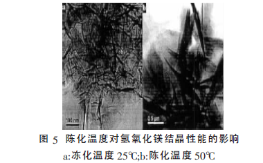 硼泥是硼化工產(chǎn)業(yè)主要垃圾,近年來因為環(huán)境污染等問題使人們注意到硼泥的綜合利用價值和潛在的發(fā)展空間。大連理工大學(xué)孫博通過TEM 等多種手段對硼泥制取的氫氧化鎂進行了分析表征。圖5 為不同陳化溫度(TEM)觀察氫氧化鎂結(jié)晶性能表明:25℃陳化形成的產(chǎn)物晶型不完整、生長不完全,在陳化溫度為50℃的條件下形成的產(chǎn)物有規(guī)則晶型,較為完整。