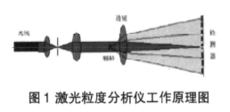粒徑大于波長的時候,由Fraunhofer 衍射理論求得的衍射光強度和Mie散射理論求得的散射光強度大體是一致的。因此,可以把Fraunhofer 衍射理論作為Mie 散射理論的近似處理。這時,光散射(衍射)的方向幾乎都集中在前方,其強度與粒子徑的大小有關,有很大的變化。即表示粒子徑固有的光強度譜,解出粒子的光強度分布(散射譜)就可以定出粒子徑。當波長和粒子徑很接近的時候,不能用Fraunhofer 的近似式來表示散射強度。這時有必要根據Mie 散射理論作進一步討論。在Mie散射中的散射光強度由入射光波長、粒子徑、粒子和介質的相對折射率來確定]。圖1為激光粒度分析儀工作原理簡圖。