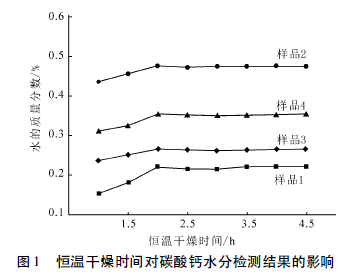 由于國標(biāo)中沒有明確指出恒溫干燥時間,首先探究了標(biāo)準(zhǔn)檢測方法中干燥時間對碳酸鈣水分檢測結(jié)果的影響,結(jié)果見圖1。