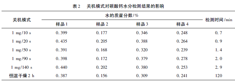 表2 是鹵素水分測定儀的關(guān)機(jī)模式對碳酸鈣水分檢測結(jié)果的影響。