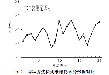 采用鹵素水分測定儀( 標(biāo)準(zhǔn)干燥升溫程序中選擇1 mg /50 s 關(guān)機(jī)模式) 與標(biāo)準(zhǔn)檢測方法( 105℃恒溫干燥箱干燥2 h) 對20 個不同的碳酸鈣樣品進(jìn)行對照實驗,結(jié)果見圖2。