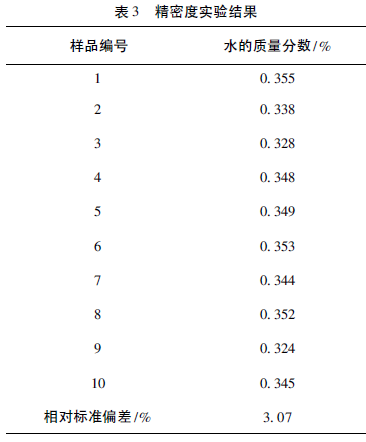 從表3 可以看出,采用鹵素水分測定儀檢測碳酸鈣水分的檢測結(jié)果的標(biāo)準(zhǔn)偏差為0. 01,相對標(biāo)準(zhǔn)偏差為3. 07%,小于5%,在允許誤差范圍之內(nèi),可滿足生產(chǎn)控制要求。