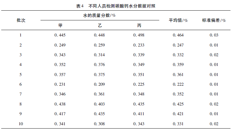 表4 是不同員工采用鹵素水分測定儀在標(biāo)準(zhǔn)干燥升溫程序中選擇1 mg /50 關(guān)機(jī)模式的條件下檢測碳酸鈣水分的數(shù)據(jù)比較。