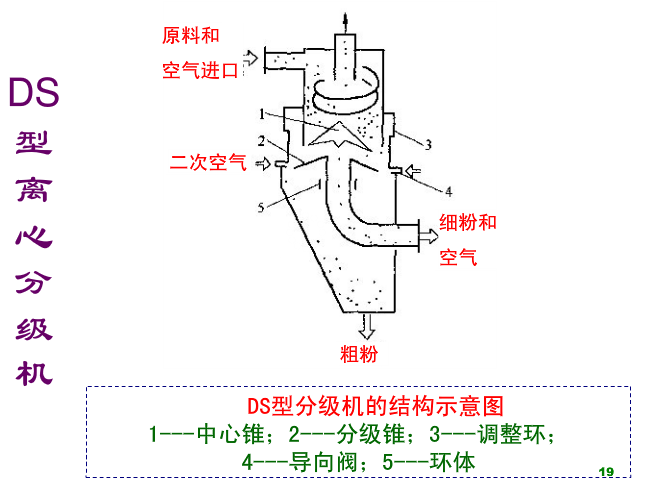 這也是一種無轉(zhuǎn)子的半自由渦式分級機,含有微細顆粒的兩相流,在負壓的作用下旋轉(zhuǎn)進入分級機。經(jīng)沿上部筒體壁旋轉(zhuǎn)分離后,部分空氣和微粉通過插入管離開分級機;剩余部分需要進一步分級的物料,通過中心錐體進入到分級區(qū),由于離心力的作用被分成粗粉和細粉。二次空氣經(jīng)過可調(diào)整角度的葉片進入分級室,以使顆粒充分分散,提高其分級效率。粗粉經(jīng)過環(huán)形通道進入卸料倉,細粉從中心錐體下部排出機外。分級細度的調(diào)節(jié)也是通過調(diào)整中心錐體的高度和二次風量來完成。DS型分級機的切割粒徑為1~300μm,分級深度可達1000g /m3,處理量為10~4000 kg/h。
