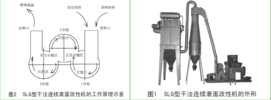 這種以SLG型連續(xù)粉體表面改性機(jī)為主的干法粉體連續(xù)表面改性系統(tǒng)采用計(jì)量控制連續(xù)連動(dòng)給料和給藥(改性劑)技術(shù)及旋風(fēng)集料和濾袋收塵以及負(fù)壓運(yùn)行原理連續(xù)收集產(chǎn)品。其主要特點(diǎn)是:①對(duì)超細(xì)粉體和表面改性劑分散性好;②粉體與表面改性劑的作用機(jī)會(huì)均等;③停留時(shí)間可調(diào);④依靠摩擦自加熱,最高可達(dá)到140℃;⑤表面包覆效果好,產(chǎn)品活化指數(shù)≥96%;⑥能耗低(超細(xì)活性輕質(zhì)碳酸鈣≤35kW·h/t產(chǎn)品);⑦結(jié)構(gòu)緊湊、自動(dòng)化程度高、操作簡(jiǎn)便、無(wú)粉塵外溢;⑧單機(jī)生產(chǎn)能力大(1~4t/h),目前正在開(kāi)發(fā)的SLG-3/900機(jī)型(國(guó)家“十一五”科技支撐計(jì)劃項(xiàng)目2008BAE60B01支持)將使其處理能力提高5t/h以上。