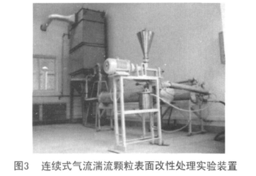 一種氣流湍流顆粒表面改性處理工藝與裝備的開(kāi)發(fā)也是近幾年表面改性與裝備技術(shù)的主要進(jìn)展之一。該方法的工作原理是采用高速氣流形成的強(qiáng)湍流場(chǎng)對(duì)顆粒進(jìn)行分散處理,使分散后的顆粒與氣體一起呈浮態(tài),然后通過(guò)霧化器將改性劑霧化后噴入已分散的、呈懸浮態(tài)的顆粒體系中,二者經(jīng)過(guò)充分接觸、混合與作用,是改性劑包覆于顆粒表面,完成顆粒的表面改性處理。圖3所示為連續(xù)式氣流湍流顆粒表面改性處理實(shí)驗(yàn)裝置。