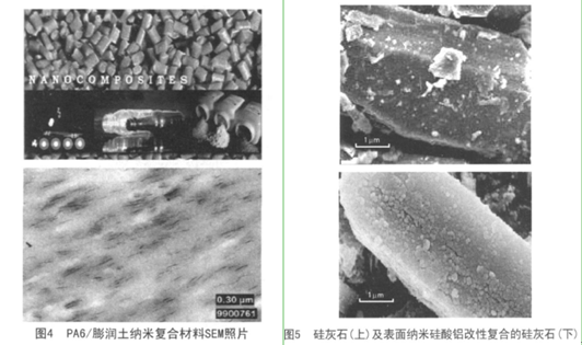 層狀硅酸鹽礦物粉體的插層改性是研究最為活躍的表面改性領(lǐng)域之一。雖然早在20世紀(jì)70年代前后就有“有機(jī)膨潤(rùn)土”這類(lèi)有機(jī)季銨鹽類(lèi)插層改性的產(chǎn)品問(wèn)世,但近10年來(lái)研究日趨廣泛和深入。除了有機(jī)膨潤(rùn)土產(chǎn)品品種和生產(chǎn)技術(shù)不斷改進(jìn)之外,聚合物/蒙脫土納米復(fù)合材料(圖4)、膨潤(rùn)土或蒙脫石的無(wú)機(jī)柱撐或交聯(lián)等的研究和產(chǎn)業(yè)化也取得了顯著進(jìn)展。特別是聚合物/蒙脫土納米復(fù)合材料已進(jìn)入產(chǎn)業(yè)化階段,對(duì)新型聚合物/納米粘土復(fù)合材料的發(fā)展有重要的推動(dòng)作用;此外,高嶺土插層(利用尿素、聯(lián)苯胺、乙酰胺等化學(xué)藥劑)納米復(fù)合材料、蛭石插層改性材料、綠泥石插層改性材料等層狀硅酸鹽礦物的插層改性技術(shù)研發(fā)也不同程度地取得一些有價(jià)值的進(jìn)展。