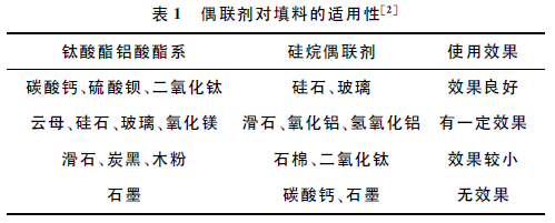 表面改性的效果隨偶聯(lián)劑、填料和基體種類的不同而異,因此為了提高復(fù)合材料的性能,必須按填料的種類及組合選擇適當(dāng)?shù)呐悸?lián)劑。偶聯(lián)劑對填料的適用性見表1。