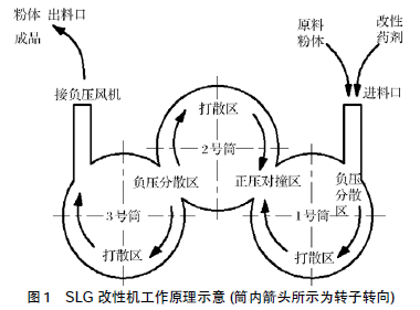 SLG 型改性機是從瑞典 AGMW 公司引進的三筒高速強烈混合表面改性機整改過來的,已應用于 1250目以上超微粉體甚至納米級粉體。其工作原理是:品字形排列的 3 個改性筒相串聯(lián) (見圖 1),每個改性筒內都設有一個高速運行的轉子和固定定子,3 號改性筒出口,外接負壓引風機。工作時,高速運行的轉子和引風機在品字形排列的 3 個筒內形成幾個工作區(qū)域,為粉體改性達到最佳效果起到極其關鍵的作用。