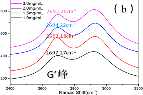 由圖9表明:G峰的波數(shù)越高,層數(shù)越少,G’峰的波數(shù)越低,層數(shù)越少。D峰和G峰的強度比ID/IG數(shù)值越大,缺陷程度越高