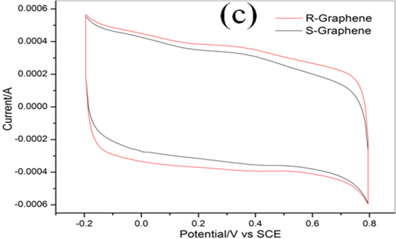 圖10 石墨烯循環(huán)伏安曲線圖(a)經(jīng)旋轉(zhuǎn)床剝離后制備石墨烯CV曲線;(b)經(jīng)超聲剝離后制備石墨烯CV曲線;(c)兩種方法制備石墨烯在10mV/s下CV曲線