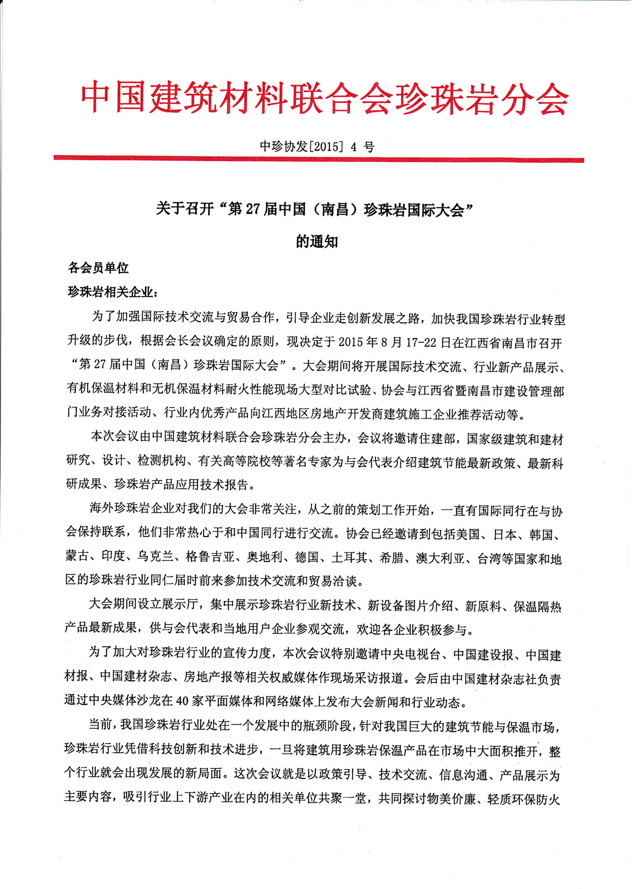 【南昌】關(guān)于召開“第27屆中國(南昌)珍珠巖國際大會(huì)”的通知
