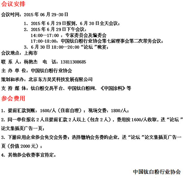 為適應(yīng)當(dāng)前形勢并利于行業(yè)長遠發(fā)展,中國鈦白粉行業(yè)協(xié)會將于2015年6月30日在上海舉辦“2015年度中國鈦白粉制造與應(yīng)用論壇——鈦白與涂料專題論壇”,以助力鈦白粉制造與涂料應(yīng)用企業(yè)在新的形勢下緊跟時代步伐,走好發(fā)展和轉(zhuǎn)型之路。會議將主要從八大議題展開討論。