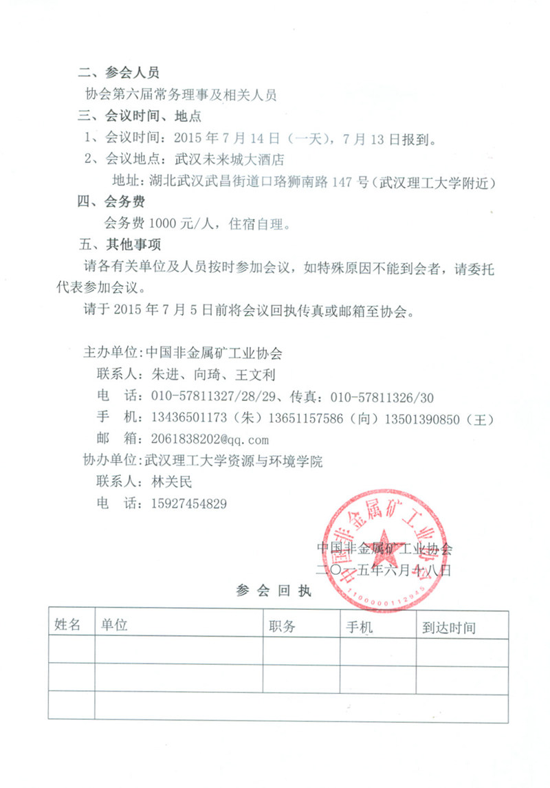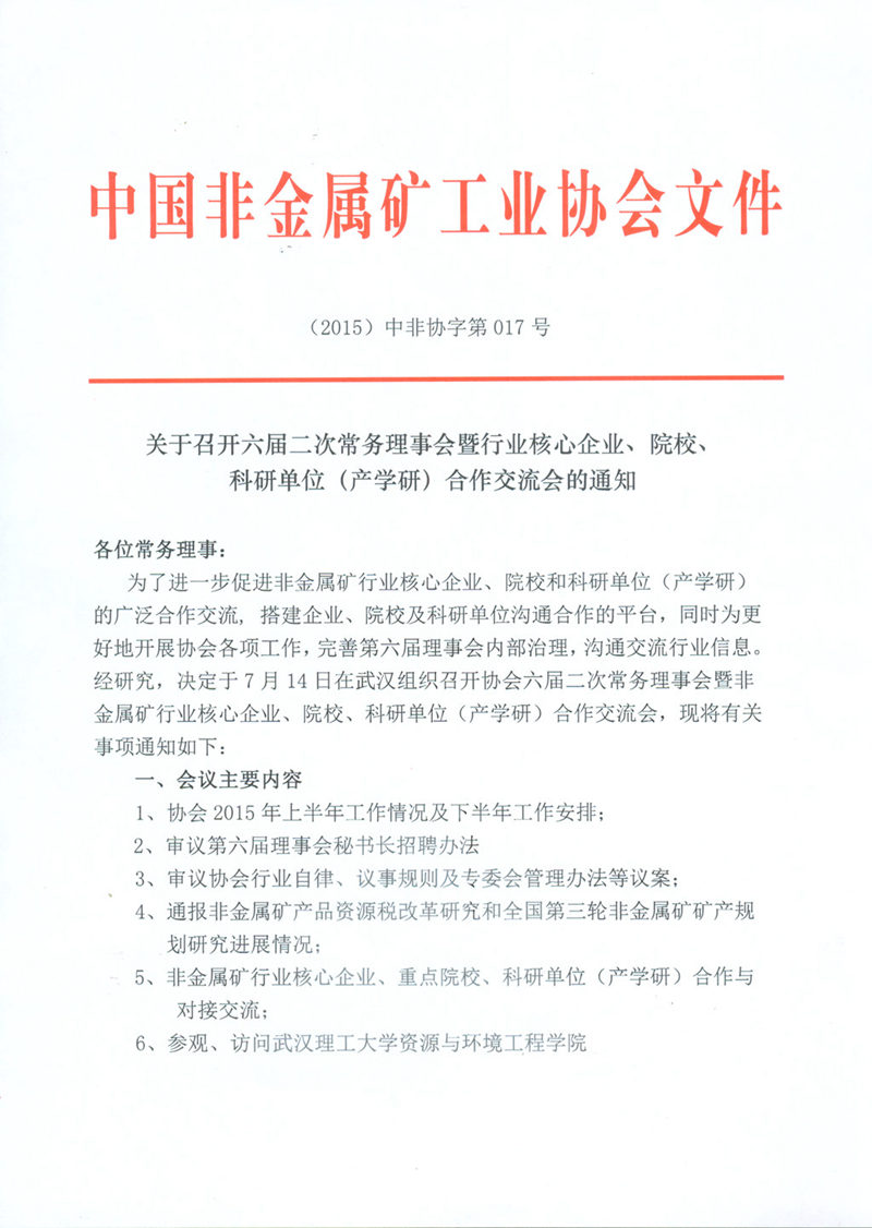 【武漢】關(guān)于召開(kāi)中國(guó)非金屬礦工業(yè)協(xié)會(huì)六屆二次常務(wù)理事會(huì)暨行業(yè)產(chǎn)學(xué)研合作交流會(huì)的通知