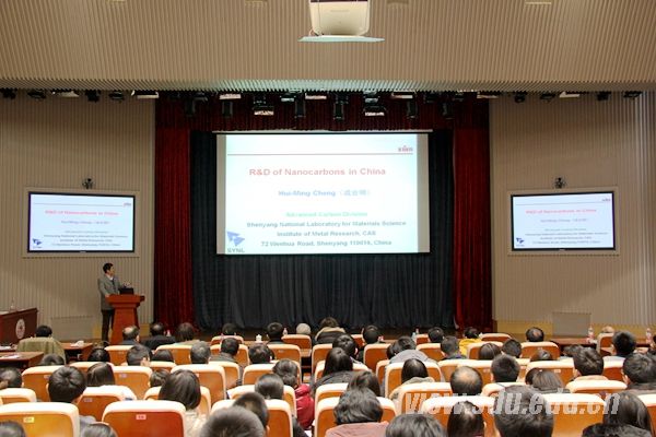 此次研討會分設(shè)碳納米材料的制備、儲能、應(yīng)用三個專題,日本信州大學(xué)Morinobu Endo 教授、萊斯大學(xué)P.M. Ajayan教授、韓國成均館大學(xué)Young Hee Lee院士、中科院物理所成會明院士首先作了大會特邀報告。在碳納米材料的制備專題中,美國賓西法尼亞大學(xué)Mauricio Terronesk教授、萊斯大學(xué)樓峻副教授、清華大學(xué)石高全教授、香港理工大學(xué)丁峰教授等就目前碳納米材料在制備方面所常用及具有現(xiàn)實(shí)意義的方法作了介紹。在儲能專題中,美國特拉華大學(xué)Bingqing Wei教授、大連理工大學(xué)丘介山教授等在鋰離子電池和超級電容器方面作了介紹。在應(yīng)用專題專題中,美國杜克大學(xué)劉杰教授、美國Laslumin LLC李雪松博士等就目前碳納米材料在工程中的應(yīng)用情況作了介紹。