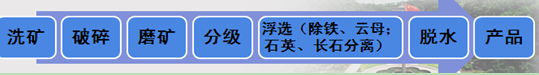 以偉晶巖產(chǎn)出的長(zhǎng)石礦加工成日用陶瓷用長(zhǎng)石粉。原加工流程為: